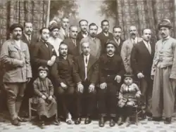 On the 5 October 1927, in Bhamdoun, Greater Lebanon, during a congress of several Kurdish notables, Xoybûn was founded by members of the Society for the Elevation of Kurdistan, Azadî (Kürdistan Teali Cemiyeti), Kürt Teşkilat-ı İçtimaiye Cemiyeti and Kürt Millet Fırkası.[9] Prominent members of the congress were Kamuran Bedir Khan, Celadet Bedir Khan, Memduh Selim, Mehdi Saïd (the brother of Sheikh Said) and Haco Agha amongst others.[10] In the same month the Xoybûn achieved a treaty with the Armenian Revolution Federation (ARF/Dashnaktsutyun).[11] The treaty was negotiated in Beirut on the 29 October by Vahan Papazian for the ARF and by Celadet Bedir Khan, Mehmet Şükru Sekban, Ali Riza (the son of Sheik Said and others on the side of the Xoybun.[12] The Xoybûn had two separate sections, an armed section and a political one. The armed wing was led by Ihsan Nuri, an Ottoman soldier. The political wing was based in Damascus, represented in several western countries and mostly by members of the Bedirxan family.[11] The Xoybûn presented itself as a progressive but pragmatic organization, which had an independence as a goal wanted to learn from former decisions which led to the failure of the Sheikh Said rebellion.[13]