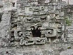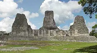 Structure I is the most notable structure in this region, due to its atypical three-tower construction instead of the usual two.[8] This structure includes three towers, roof combs, steep stairways, and non-functional doors.[9] It is hypothesized that it may have been constructed in an effort to mimic the style of pyramid-temples found in Tikal and elsewhere.[10]