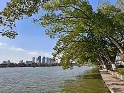 ![]() Xuanwu Lake, with the Nanjing City Wall in the foreground, its islands in the center of the lake, and Nanjing's skyline and mountains in the distance. This is seen from Taicheng, the part of the City Wall that lines the west side of the lake. | |