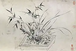 Already an accomplished painter in her teenage years,[1] Xue was well known for her artistic talent. Her work was considered similar to that of Chen Chun, who was an inspiration for many of her era.[22] One of her paintings was considered "the most accomplished work of its kind in the whole of the Ming period",[4] and contemporary art critics regarded her as "a master of technique".[4] Hu Yinglin considered her to be at the pinnacle of contemporary painting, asking, "What famous painter with skilled hands can surpass her?"[3] and claiming that "[she] surpasses anyone in the painting of bamboo and orchids."[1] She was also keenly admired by eminent painter and art critic Dong Qichang, who was inspired to copy the entire Heart Sutra in response to Xue's painting of Guanyin;[1] he claimed that "None [of Xue Susu's works] lacks an intention and spirit that approaches the divine."[3] Although she painted the standard subjects of landscapes, bamboo and blossoms (being particularly fond of orchids), Xue was noted for her work in figure painting, which was a comparatively unusual subject for courtesans.[1] Examples of her paintings are displayed at the Honolulu Museum of Art and the Asian Art Museum of San Francisco.[23]