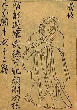 Xun You (157–c.September 214), courtesy name Gongda, was a statesman who lived during the late Eastern Han dynasty of China and served as an adviser to the warlord Cao Cao.[2] Born in the influential Xun family of Yingchuan Commandery (around present-day Xuchang, Henan), Xun You was recruited into the civil service by the general He Jin. When the warlord Dong Zhuo hijacked and controlled the Han central government between 189 and 192, Xun You plotted with four others to assassinate him but was discovered and imprisoned. Following his release after Dong Zhuo's death, he wanted to serve as the Administrator of Shu Commandery (around present-day Chengdu, Sichuan) but eventually settled as an official in Jing Province.