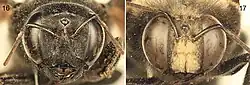 Males' bodies are covered in a dark to black pubescence except their faces. The middle section on their back is mostly light or pale. The first metasomal tergum, or back, with subhorizontal dorsal surface rounds into the anterior surface.[6]