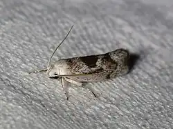 The wingspan is about 28 mm. The forewings are white rather densely irrorated with fuscous and with a triangular fuscous suffusion on the inner margin before the middle. There is a short longitudinal suffused mark in the disc before the middle and a very distinct outwardly oblique line from the costa at two-thirds, angulated in the disc, and continued parallel to the hindmargin to the inner margin at three-fifths. There is also an indistinct suffusion on the middle of the hind margin. The hindwings are pale-grey, whitish toward the base.[2]