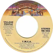 "Y.M.C.A." is a song by American disco group Village People, written by Jacques Morali (also the record's producer) and singer Victor Willis[1] and released in October 1978 by Casablanca Records as the only single from their third studio album, Cruisin' (1978). A medley with "Hot Cop" reached No. 2 on the US Billboard Dance Music/Club Play Singles chart,[2] while the song reached No. 2 on the Billboard Hot 100 in early 1979, placing behind both "Le Freak" by Chic and "Da Ya Think I'm Sexy?" by Rod Stewart.[3] Outside the U.S., "Y.M.C.A." reached No. 1 on the UK singles chart in 1979, becoming the group's biggest hit. It has sold 12 million copies worldwide.[4] In 2024, 46 years after its release, "Y.M.C.A." spent six weeks at No. 1 on the Billboard Dance/Electronic Digital Song Sales chart.[5]