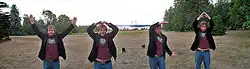 The dance originated during the group's performance of the song on the January 6, 1979 episode of American Bandstand. Host Dick Clark then said to Willis that he would like to show him something, playing the song again with the audience doing YMCA hand gestures.[32][33] Willis immediately picked up on the dance and mimicked the hand movements back at the audience as other Village People members stared at him with puzzled looks. Clark then turned to Willis and said, "Victor, think you can work this dance into your routine?" Willis responded, "I think we're gonna have to."[32] In a 2008 retrospective article for Spin, Randy Jones explained that the dance originated as a misunderstanding: the group's original choreographed dance had the group clapping above their heads during the chorus and the audience, believing them to be making the letter "Y", began following suit.[34]