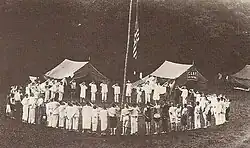 During the summer session, campers attend daily chapel services and a midweek colloquial Vespers service; however, most alumni of Camp Fitch would agree that the spiritual highlight of summer camping period is the unique Candlelight service held at the close of each week.[1][7][27] Authored by Raymond L. "Curly" Johnson, Fitch's director from 1928 to 1935, this service blends lessons of character building with Christian themes. Johnson originally conducted the service himself for campers, and the version used today has changed very little from its original form. At the end of the service, attendee's are tasked with setting a personal goal to work towards during his or her time away from Camp Fitch.[28] In 1982 to honor Johnson and his impact on Fitch's spiritual heritage, the camp chapel was renovated and renamed "Curly's Chapel".[7]