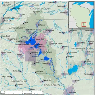 The Yahara River (/jəˈhærə/) is a tributary of the Rock River in southern Wisconsin. It is about 62 miles (100 km) long[3] (including the distance across intervening lakes), and drains an area of 536 square miles (1,390 km2).[4] Via the Rock River, it is part of the watershed of the Mississippi River. The Yahara River links the lakes around which the city of Madison was built.