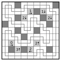 Yajilin is played on a rectangular grid of squares. At the beginning, cells are either indicative (containing a number and an arrow pointing "up", "down", "left," or "right") or empty. Black cells, an additional cell type, may be discovered during the solving process.