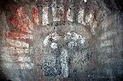 The rock paintings are stylized polychromatic paintings using white, red and black colors. The paintings are said to have been enhanced by Lucullus Virgil McWhorter using enamel paints, a technique unacceptable to today's preservation community.