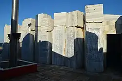 The monument, which is in the middle of a small artificial hill, consists of piled marble blocks flanking a hallway and containing the names of around 3,000 earthquake victims.[1] Next to each name, there is a tiny hole to hold a flower.[4] The monument's hallway is paved with colorful mosaic figures, of which small stone pieces were made by the children in Yalova.[1] There are also two halls on both sides of the monument's[6] hallway exhibiting photographs taken after the earthquake.[2][5]
