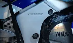 The FZR1000 chassis provided the biggest advancement over the original Yamaha FZ750. A major reduction of frame weight resulted from the use of an all aluminum square section 'Deltabox' perimeter type frame. The frame consisted of cast and extruded sections, welded together and provided a large weight reduction, in region of a 40% over the equivalent steel frame.. Although first seen on Yamaha racing machines such as the FZ750 OU74 race machine [6] and in use on other smaller capacity or racing motorcycles, this was the first use on such a large production motorcycle. Aluminum perimeter frames are now common amongst contemporary sports motorcycles. The new frame was complemented by large 41mm diameter Telescopic forks, cast aluminum hollow spoke wheels suitable for radial tyres.