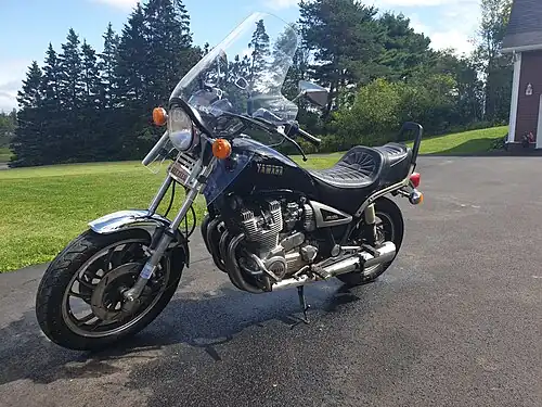 The Yamaha XJ1100 is a Japanese standard motorcycle that was produced for only one year in 1982 in the US and 1983–84 in Canada. This motorcycle employed almost the same motor as its predecessor, the XS 11. The motor was a four-stroke, transverse-mounted four-cylinder engine with dual overhead cams. Its 1101cc engine was making 95 hp at the crank, paired with a 5-speed gearbox and shaft drive.[1]