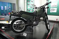 This is a 350cc four stroke enduro (motorcycle) with long travel suspension. It is street legal because it has mirrors, indicators, a horn, a headlight, a tail light and a licence plate holder.[1][2]
