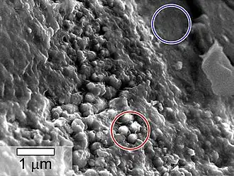 At a microscopic level, areas of the meteorite with spheres are rich in carbon compared to surrounding areas lacking such spheres. The carbon-rich spheres and the observed micro-tunnels may have been formed by biotic activity, according to NASA scientists.[2][5][6]