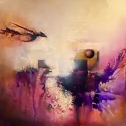 Recurring key features recognized in her works include her use of the color orange, the natural world, as well as the exploration of spiritual themes, such as mysticism and the esoteric, and the use of symbols connected to them, such as geometric mandalas.[11][5][9] She also employs additional symbols of personal meaning.[9] Her symbolic motifs include the Rose of Jericho, which she represents as a sphere and has used as a symbol of the immortality of the soul, itself a frequent theme in her work, as well as for the interconnection between art, nature and life.[11][2]