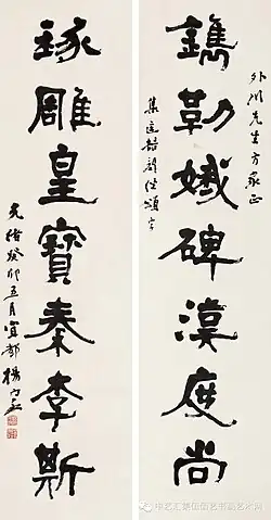 With the encouragement of Pan Zuyin, Yang became an accomplished calligrapher of the Stele School of Chinese calligraphy.[9] When he went to Japan, he introduced the style to Japanese calligraphers, offering them "virtually an unprecedented aesthetic style" and revolutionizing Japanese calligraphy.[9] He was considered a talented artist by famous Japanese calligraphers such as Miyajima Seiichiro, Kusakabe Meikaku, Iwaya Osamu, and Matsuda Sekka. Iwaya Osamu and others bought hundreds of sheets of Yang's works.[10] Yang wrote many essays on the Stele School of calligraphy, which were published by Japanese scholars in two volumes, Ping bei ji (評碑記, "Record of stelae criticism") and Ping tie ji (評帖記, "Record of model-letters criticism").[9]