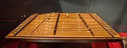 The yanggeum (Korean: 양금; Hanja: 洋琴) is a traditional Korean string instrument. It is a hammered dulcimer. Unlike other traditional Korean instruments (most of which have silk strings), the yanggeum has metal strings. It is played by striking the strings with a bamboo stick. Yanggeum means a stringed instrument of the West (yang). The yanggeum is also called seoyanggeum ("Western stringed instrument") or gura cheolsageum (歐邏鐵絲琴,"European metal stringed instrument"). The origin of the yanggeum is based on a South asian instrument called the santoor. The Chinese introduced it into Korea in the 18th century. Its body is flat and trapezoidal, with seven sets of four metal strings. The right hand strikes the strings with a thin bamboo strip.[1]