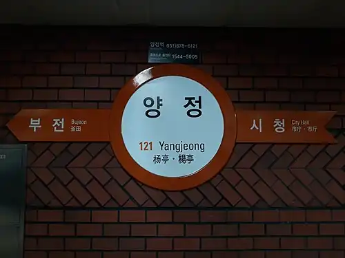 Yangjeong Station is a station of Busan Metro Line 1 in Yangjeong-dong, Busanjin District, Busan, South Korea.