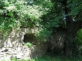 The defensive castle was built on a rectangular plan, on the north side of the peninsula, the only one that led to the village.[1] It was a stone structure having: a dwelling, a chapel, and round and square towers, surrounded by a wall,[2] which, damaged in several places later, also protected the church. The castle's corners were fortified with towers, of which two are best preserved: a quadrilateral and cylindrical one on the north side, converted into the parish priest's cellar. Its preserved remains by the thickness of the walls testify to the castle's former fortress.[1] The Roman Catholic Church standing among the ruins[1] is probably a converted castle chapel.[2]