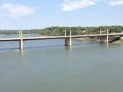 Yankton, as viewed from the Meridian Bridge with the Discovery Bridge crossing the Missouri River in the foreground, and the steeple of the Bishop Martin Marty Chapel in the background