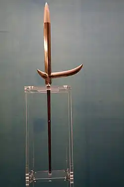 Yari (槍) is the term for a traditionally-made Japanese blade (日本刀; nihontō)[2][3] in the form of a spear, or more specifically, the straight-headed spear.[4] The martial art of wielding the yari is called sōjutsu.