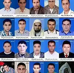 On August 23, 2011, detainees were held in a warehouse located in the Khalida Ferjan neighborhood in Salahaddin, south of Tripoli, adjacent to the Yarmuk Military Base. The detainees, numbering approximately 153, were almost entirely civilians. These detainees were often beat, electrocuted, starved, and even raped.[2] Guards from the Khamis Brigade conducted a roll call of the detainees and subsequently carried out a vicious attack. Survivors recounted guards opening fire from the roof of the warehouse and throwing grenades into the building. Many detainees were shot and killed during the assault.[3][4] 53 skulls were later found in one location and other corpses were discovered in a nearby shallow grave but there was a deliberate attempt to destroy victims' bodies. There are known to be at least 20 survivors.[4][5] Videos were taken of the site of the massacre, showing the remains of the bodies which were mostly ashes.[6][7][8]