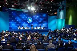 Medvedev gave significant speeches at the forum, including a speech at the September 2010 forum (entitled "The Modern State: Standards of Democracy and Criteria of Efficiency"),[4] in which Medvedev "told a large audience of academics, politicians, and economists ... that parliamentary democracy would provide a 'catastrophe' for Russia" by leading to social upheaval and turmoil.[5] Among the notable persons who attended the forums were Italian prime minister Silvio Berlusconi and American Nobel laureate economic Paul Krugman,[1] and Michael McFaul.[6] The conferences were "largely presented as the Russian equivalent of the annual World Economic Forum in Davos."[1] However, as Medvedev's influence waned, the Global Policy Forum "soon exhausted its potential ... and became nearly forgotten."[1]