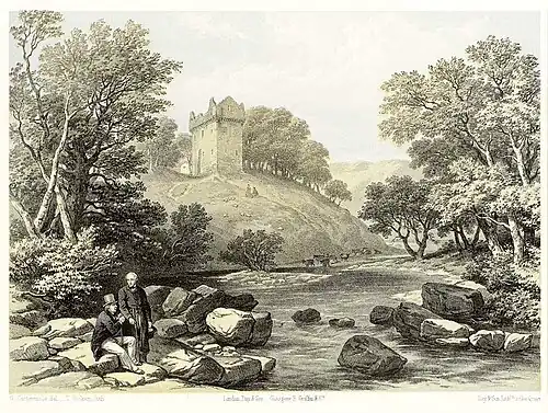 In August 1831, suffering from the after-effects of a stroke and hoping to regain his health in Italy, Scott invited Wordsworth to visit him before his departure. Suffering health problems of his own, Wordsworth delayed his departure and only reached Abbotsford, accompanied by his daughter Dora, on 19 September, five days before Scott was due to leave. On 20 September they all took a trip to Newark Castle on the Yarrow which might, Wordsworth realized, be Scott's last. This day's journey was the occasion of two poems by Wordsworth, one a sonnet beginning "A trouble, not of clouds, or weeping rain",[57] and the other "Yarrow Revisited", written a few weeks later in October 1831.[58] The subject of this latter poem is not so much the Yarrow itself as the changing reactions to it of both Wordsworth and Scott through the course of their adult lives; it is the poet's act of homage to his old friend.[59] It was published in his collection, Yarrow Revisited and Other Poems, initially in April 1835,[60] though new editions were needed in 1836 and 1839, this being the first of Wordsworth's books to meet with commercial success.[61] Wordsworth was not finished with the subject of his memories of the Yarrow: he returned to it in passages of his "Extempore Effusions upon the Death of James Hogg" in 1835, and again in "Musings near Aquapendente" in 1837.[62]