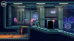 Yars Rising has been described as a metroidvania game with 2D exploration and labyrinthian level design.[1][3] The player is tasked with hacking into terminals while progressing through the game, giving the player-character different abilities by altering her DNA.[2]