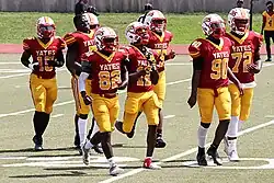 Historically the football game between Yates and Wheatley High School was among the most prominent ones in the United States.[12] Beginning in 1927,[54] each Thanksgiving Day the school's football team played Yates High School's football team at the Jeppeson Stadium.[55] The Yates-Wheatley Thanksgiving football match, described by On American Soil: How Justice Became a Casualty of World War II author Jack Hamann as "the most important noncollege football game in the country", often had crowds that had over 30,000 people.[56] The rivalry declined after Yates joined the UIL, and after the football leagues integrated the Thanksgiving Day Yates-Wheatley game ended.[57]