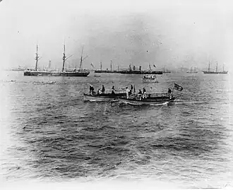 San Francisco arrived at Hampton Roads, Virginia, in February 1893 and with other U.S. and foreign ships, assembled for the naval review. "I was much impressed by the smartness and cleanliness of the British warships. No others seemed as well kept, with the exception of our own. The peculiarities of the French construction and arrangement came in for considerable attention. The appearance of their ships seemed almost grotesque. The Italian ships seemed to be modeled after the British. The discipline of the German tars caused much comment. It seemed so unnecessarily strict."[25] Stirling transferred to the Charleston in October 1893, when the cruiser steamed south from Hampton Roads towards the Strait of Magellan on its return to the Pacific Coast. Charleston anchored at Rio de Janeiro, Brazil where it was ordered to protect American interests and shipping from disturbance during the Brazilian Naval Revolution that had erupted in September with Brazilian admirals Custódio José de Melo and Saldanha da Gama commanding a rebel force that included the formidable battleship Aquidaban, several cruisers, Republica, Tamandaré, Trajano, Guanbara and a few smaller frigates and gunboats that were blockading the port of Rio de Janeiro in a mutiny against the government of General Floriano Peixoto whose regime was recognized by the United States.[26] When Charleston arrived, there was a British gunboat and two Portuguese cruisers in the harbor. Charleston's captain, Henry F. Picking, due to his rank, became senior officer of the foreign navies in port and by international custom was regarded as the leader in concerted actions. To determine whether the city could be bombarded by the rebel navy under the rules of war, it was necessary to determine whether the city was fortified. Picking ordered Stirling and Ensign H. E. Smith ashore to find out.