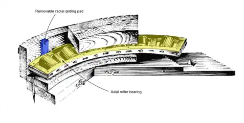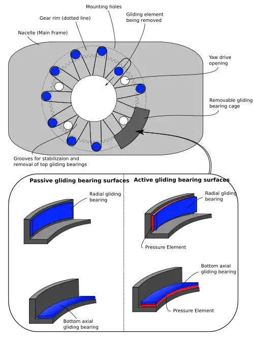 The hybrid yaw bearing system combines the solutions old windmills used. This system comprises multiple removable radial gliding pads in combination with an axial roller bearing.[1]