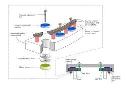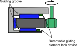 In its simplest form, the gliding yaw bearing uses pads (usually made out of polymers) distributed around the three contact surfaces to provide a proper guiding system for the radial and axial movement with relatively low friction coefficient. Such systems are economical and very robust but do not allow individual adjustment of the axial and radial gliding elements. This function importantly minimizes the axial and radial "play" of the gliding bearing due to manufacturing tolerances as well as due to wear of the gliding pads during operation.