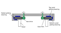 - Gliding Yaw Bearing: Dry or lubricated gliding bearing with plurality of axial and radial gliding pads being in friction contact with a large diameter steel disk, usually combined with the gear-rim as a single element