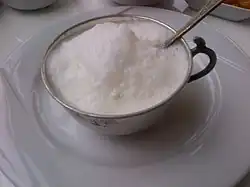 Yayık ayranı, also known as Turkish buttermilk, is a traditional Turkish drink produced from fermented buttermaking by-products, water and salt. It has been traditionally prepared in barrel churns or skin bags. Despite the similar name, it is distinct from ayran.[1] Goat,[2] sheep, or cow's milk can be used for Turkish buttermilk production. Certain acid curd cheeses such as çökelek could also be obtained from yayık ayranı when heated.[1]