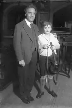 Menuhin's first violin instruction was at age four by Sigmund Anker (1891–1958); his parents had wanted Louis Persinger to teach him, and Persinger agreed. Menuhin took lessons for a while from Persinger at his Hyde Street studio. He made his first public solo appearance in November 1921, at a pupil's concert.[3] On 29 February 1924, he formally debuted at the Oakland Auditorium followed by a solo performance with the San Francisco Symphony under the direction of Alfred Hertz and a recital at the Scottish Rite Hall. His reputation preceded him to New York for his debut there on 17 March 1926, at the Manhattan Opera House.[4] In 1923, when he was seven years old, Menuhin appeared as solo violinist with the San Francisco Symphony Orchestra. Persinger then agreed to teach him and accompanied him on the piano for his first few solo recordings in 1928–29.