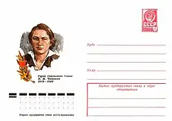 Yelizaveta Ivanovna Chaikina (Russian: Елизавета Ивановна Чайкина; 28 August 1918 – 23 November 1941) often referred to as Liza Chaikina, was the Secretary of the Kalinin Komsomol Penovsky underground committee, a Soviet partisan detachment organizer and posthumous Heroine of the Soviet Union.[1]
