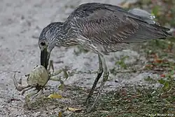 The yellow-crowned night heron eats mainly crustaceans (crabs and crayfish) as well as insects, some fish (eels and pipefish)[12] or worms (leeches and other aquatic worms).[12] Crabs preyed upon include fiddler crabs, marsh crabs, blue crabs (Callinectes sapidus, Callinectes similis and Cardisoma guanhumi) and green crabs.[12][14] It can also feed on amphibians, molluscs (mussels and snails),[14][12] lizards, snakes,[12] small rodents and small birds. The geographic location of the heron is closely related to the prey it may find, and the size and shape of its bill allows it to hunt for prey of specific size.[15]