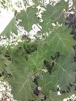 The plant has ovate-oblong, sinuated leaves that are unequally paired, with blades measuring 4-9cm × 2-4.5cm. They have an acute apex, unequal lobes and are either pinnate or possessive of usually 5-9 lobes. The veins and stalks of the leaves are prickly, and the stalks have a length of 2-3.5cm.