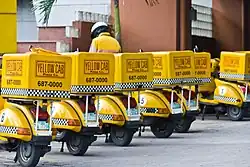 The first branch of Yellow Cab Pizza Co. opened along Makati Avenue in Makati in April 2001.[5] Because of having "yellow cab" in its name, many people thought of the chain as a taxi business; however, the name is a reference to the way it frequently uses the colors black and yellow, a pattern seen on New York City taxicabs.[6][7] The company's delivery service uses Vespa scooters.