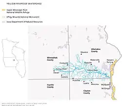 The Yellow River is a 53.5-mile-long (86.1 km)[2] tributary of the Mississippi River in northeastern Iowa. It originates in southwestern Winneshiek County and flows through southern Allamakee County, receiving tributaries from northern Clayton County, before joining the Mississippi near Marquette and Effigy Mounds National Monument.