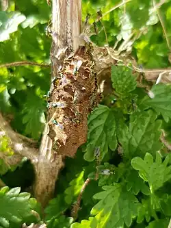 Yellow admiral cocoon covered in Pteromalus puparum wasps