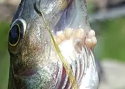 Clinostomum marginatum is a species of parasitic fluke (class Trematoda).[1] It is commonly called the "Yellow grub". It is found in many freshwater fish in North America, and no fish so far is immune to this parasite. It is also found in frogs. Clinostomum marginatum can also be found in the mouth of aquatic birds such as herons and egrets. They are commonly present in the esophagus of fish-eating birds and reptiles. Eggs of these trematodes are shed in the feces of aquatic birds and released into water. Aquatic birds become hosts of this parasite by ingesting infected freshwater fish. The metacercariae are found right beneath the skin or in the muscles of host fish.
