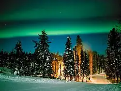 Yellowknife is on the Canadian Shield, which was scoured down to rock during the last ice age.[39] The surrounding landscape is very rocky and slightly rolling, with many small lakes in addition to the larger Great Slave Lake.[40] Trees such as spruce and birch are abundant in the area, as are smaller bushes, but there are also many areas of relatively bare rock with lichen.[41] Yellowknife's high latitude causes a large variation between day and night. Daylight hours range from five hours of daylight in December to 20 hours in June. Civil Twilight lasts all night from late May to mid-July.[42]