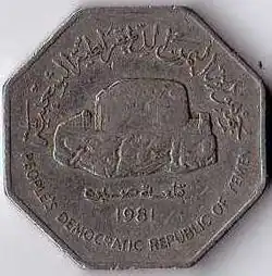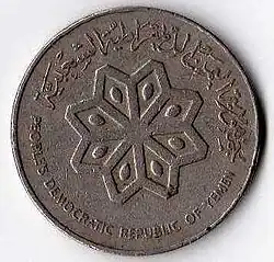 In 1971, coins were issued in the name of "Democratic Yemen", changing to the "People's Democratic Republic of Yemen" in 1973. That year, aluminium 2+1⁄2 fils were introduced, followed by aluminium 10 fils and cupro-nickel 100 and 250 fils in 1981. The 10 fils was scalloped shaped whilst the 100 fils was octagonal.