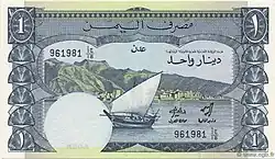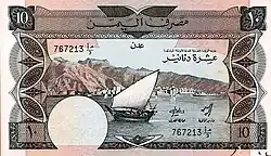 In 1984, the Bank of Yemen introduced 500 fils as well as 1 dinar, 5 dinar, and 10 dinar notes that are like the preceding issues of South Arabia, except the English text and printer's imprint have been removed from the front, the name of the issuer has changed and now appears on the back, along with the name of the capital (ADEN).[2]