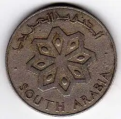In 1965, coins (dated 1964) were introduced for both the Federation of South Arabia and the Protectorate of South Arabia in denominations of 1, 5, 25 and 50 fils. The 1 fils was struck in aluminium, the 5 fils in bronze and the higher two denominations in cupro-nickel.
