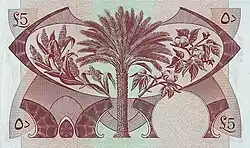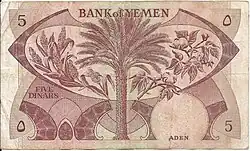 5 dinars | Pink | Dhow boat with Port of Aden in background | Date palm, millet and cotton | ||