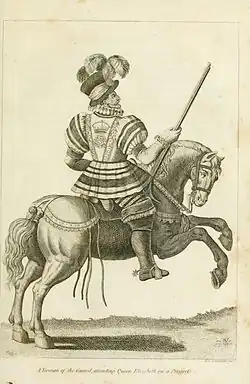 The yeomen of the Guard were clothed in 'large jackets of damask, white and green, goodly embroidered both on their breasts before and also on their backs behind, with round garlands of vine branches, beset before richly with spangles of silver and gilt, and in the middle a red rose, beaten with goldsmiths' work, with bright halberds in their hands'.[3]: 63-4
