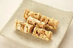 Yeot-gangjeong (엿강정) is a candy bar-like variety of hangwa (traditional Korean confection) consisting of toasted seeds, nuts, beans, or puffed grains mixed with mullyeot (rice syrup).[1][2][3] In general households, they usually make and eat yeot-gangjeong during Korean holidays and Jesa. Or, it is made and sold as a winter snack and is usually eaten during holidays and feasts.